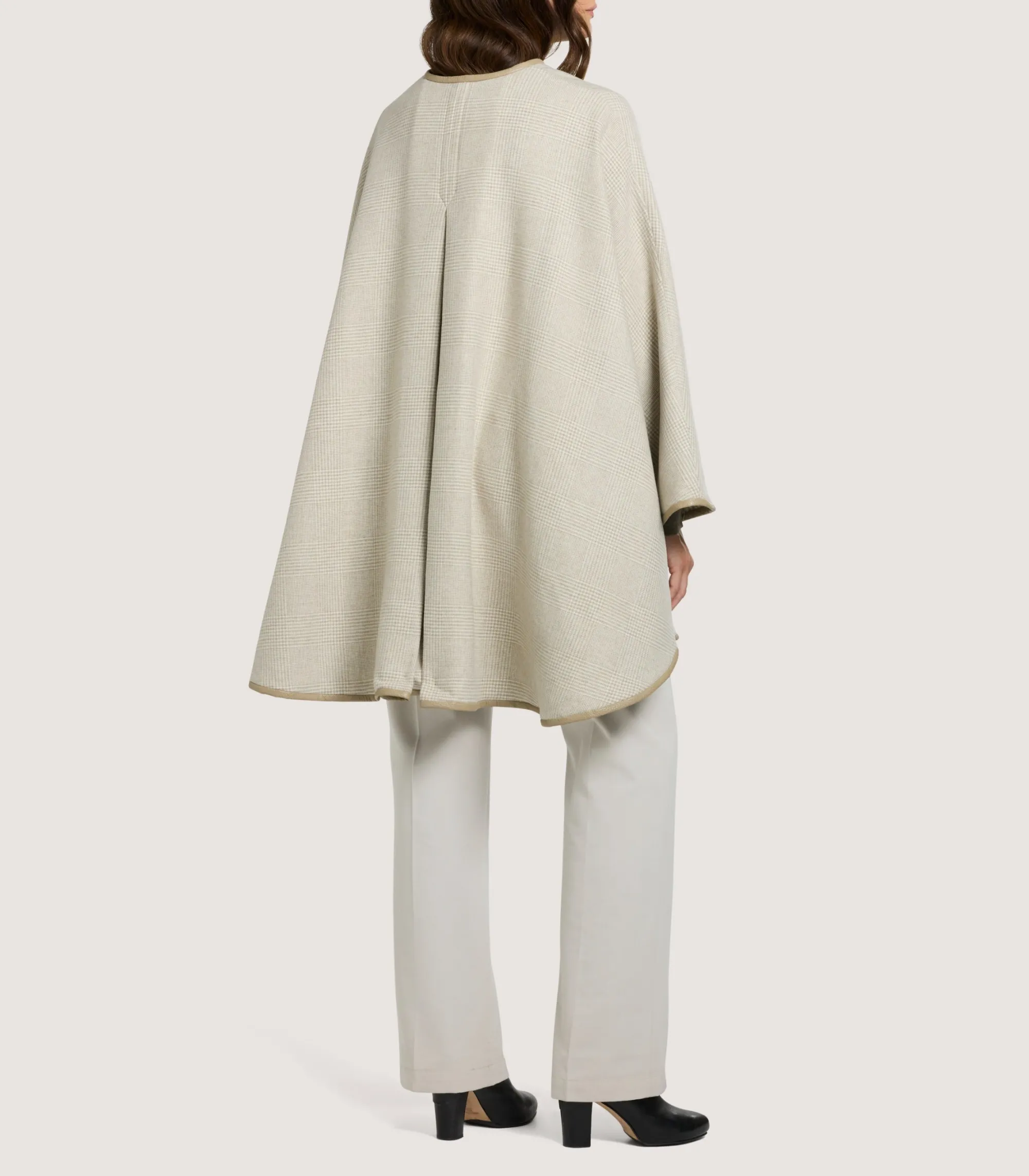 This neutral-coloured cape is made from double-face wool cashmere with a leather trim. It features a Prince of Wales Check on the external shell and a Shepherd Check on the internal lining. The belt allows you to accentuate the waist.
