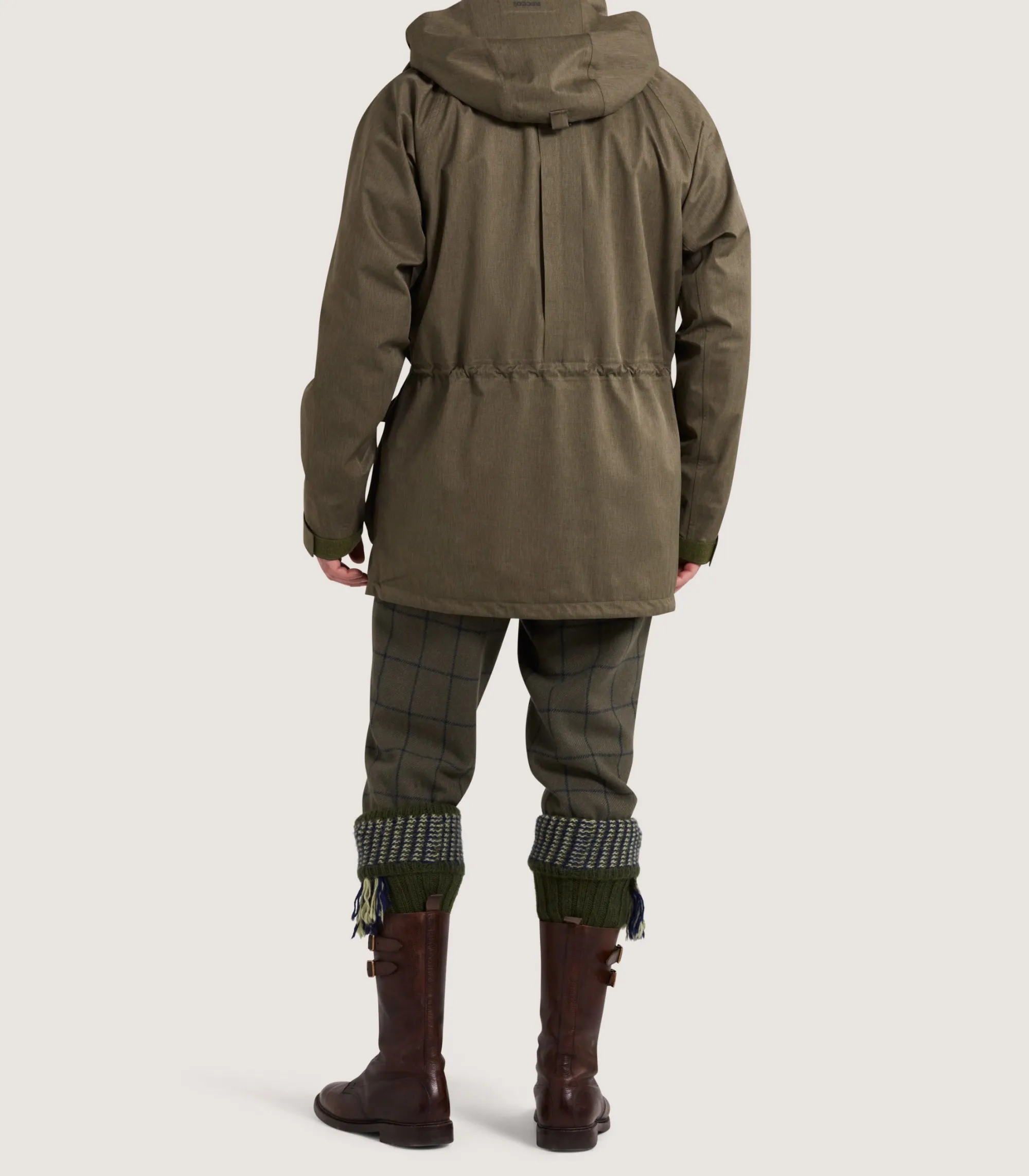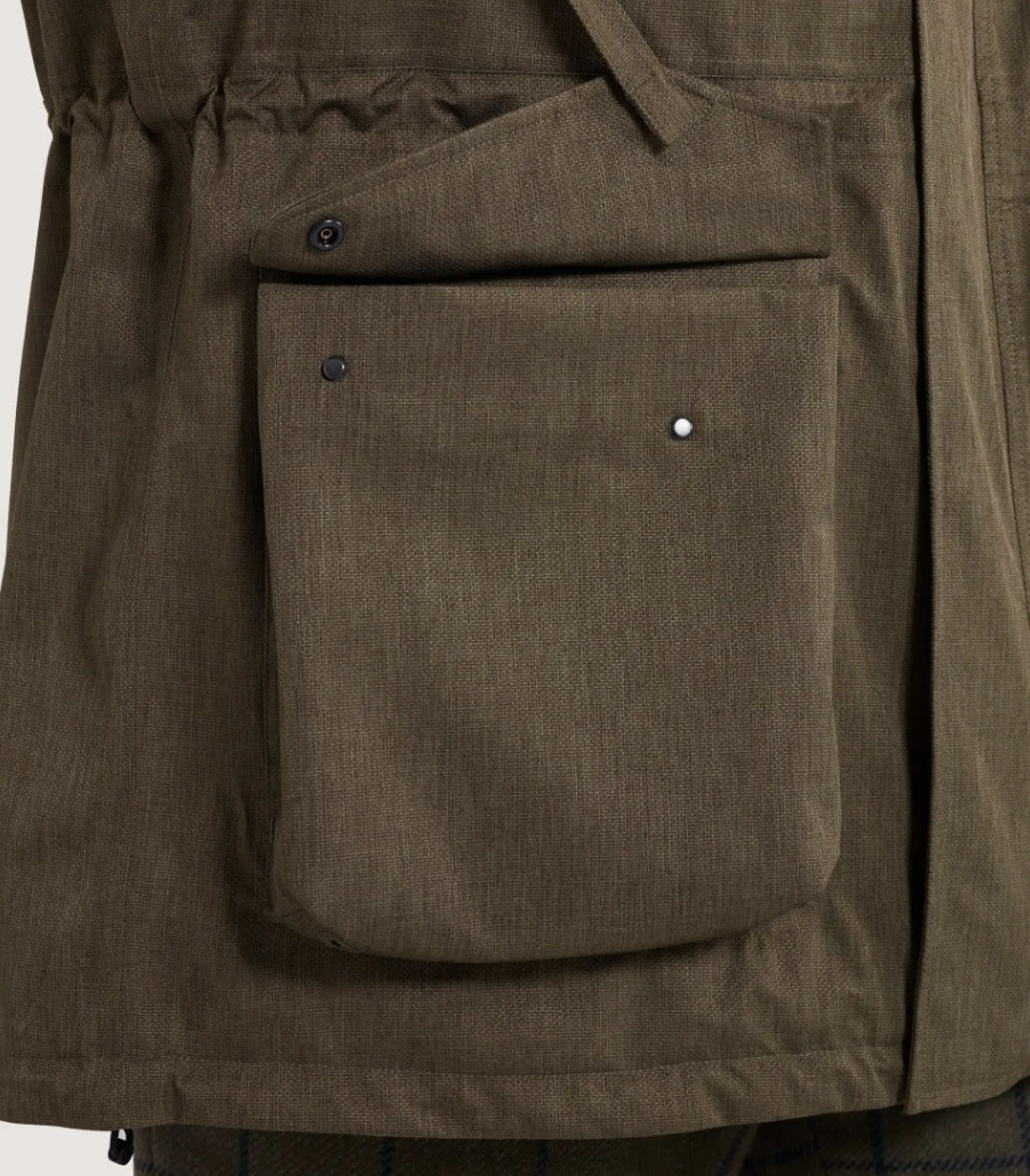 This field coat includes a combination of technical features to keep you dry and comfortable — including centralised back action, a reinforced hood that’s detachable and a drop seat detail to keep you dry when seated on wet surfaces. It’s available in drab green.