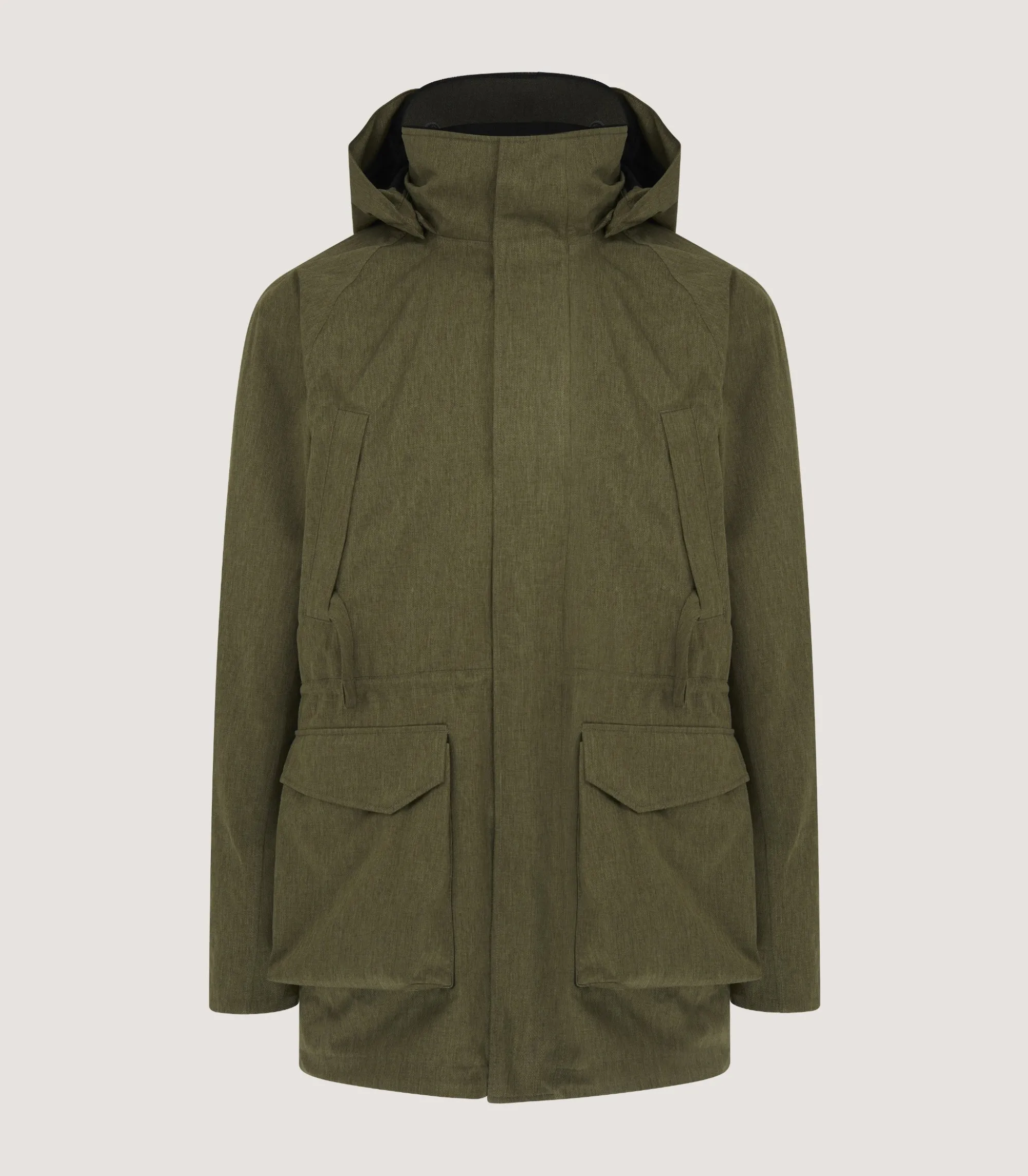 This field coat includes a combination of technical features to keep you dry and comfortable — including centralised back action, a reinforced hood that’s detachable and a drop seat detail to keep you dry when seated on wet surfaces. It’s available in moss green.