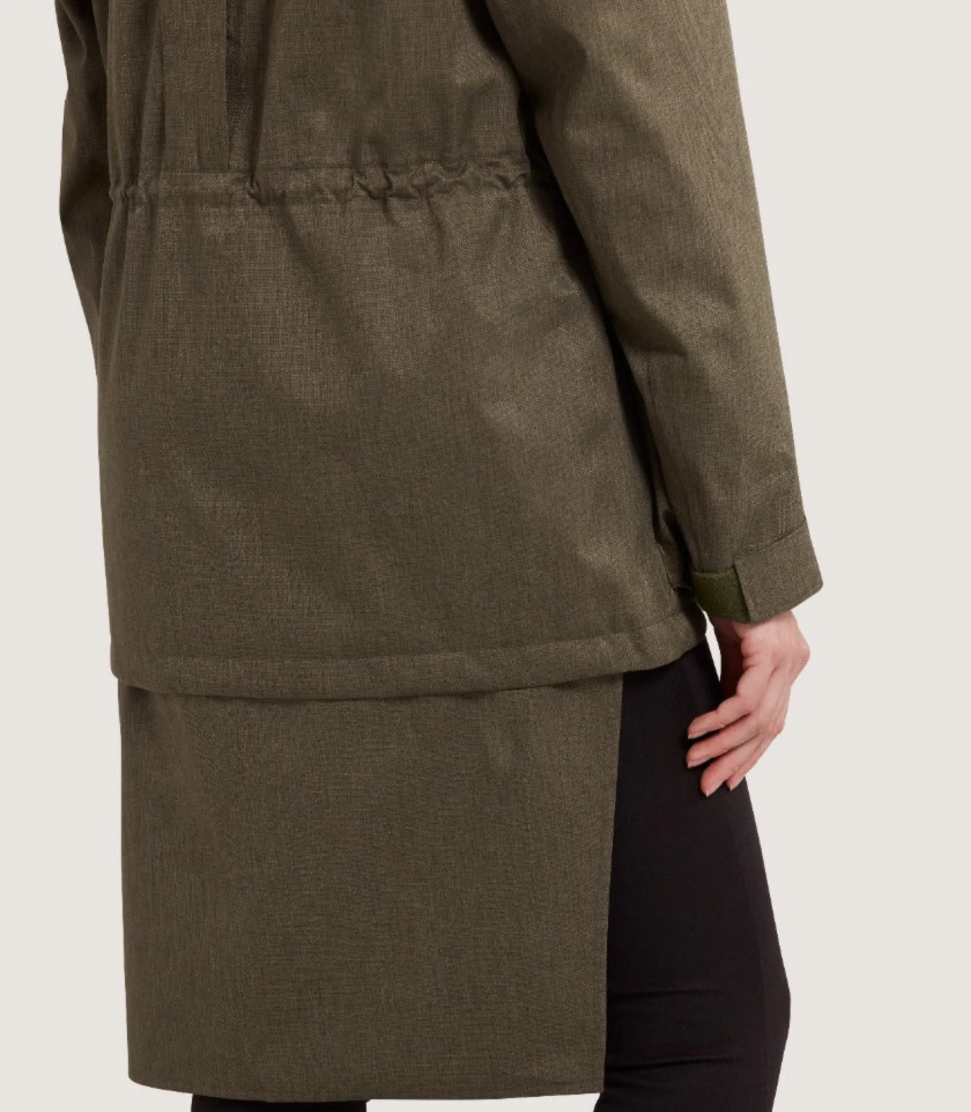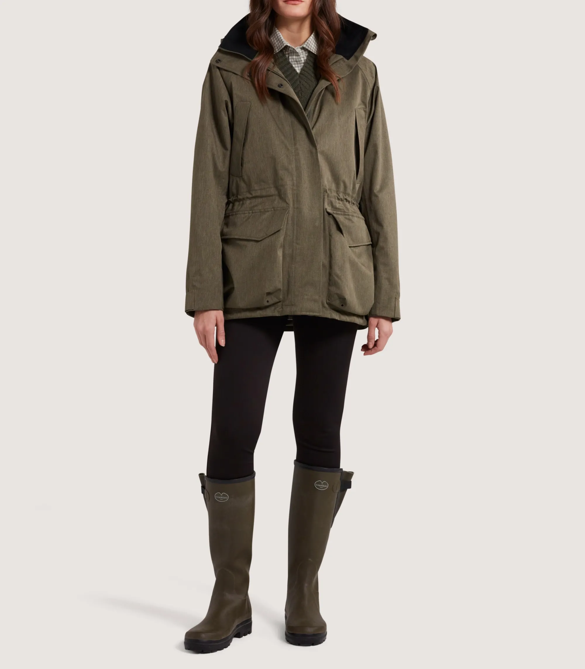 . Relaxed fit for comfort during a day out in the field . Adjustable hem and waist channel. Long in sleeve for shooting. Model is wearing a size S. Model measures: height 5’7″/ 171.5cm, bust 33.5″/ 85cm, waist 26.6″/67.5cm, high hip 33.1″/ 84cm