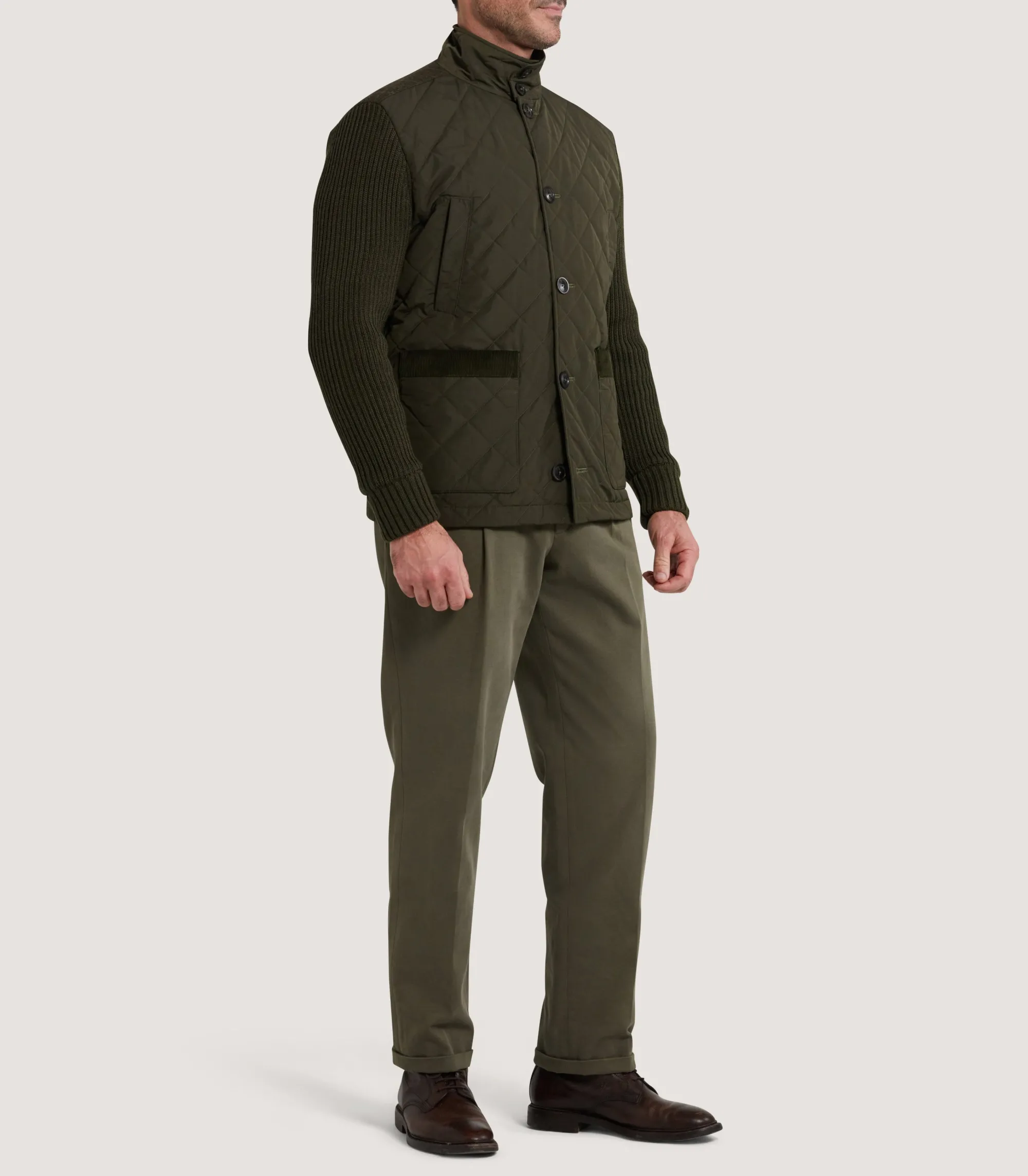 This cardigan is a hybrid outerwear piece that combines knitwear with quilted nylon fabric and tweed yoke. Available in a deep green loden, it’s an elevated everyday outerwear option.