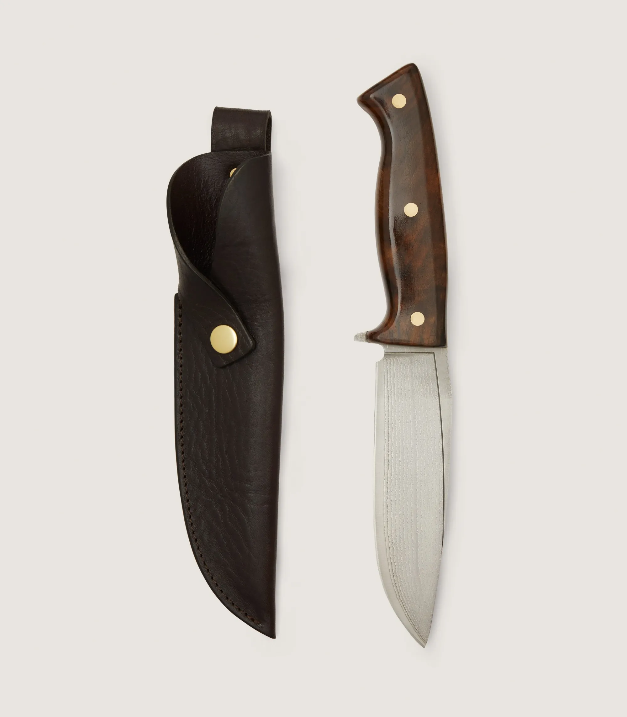 Crafted using CNC milling, allowing for blade geometriesthat are impossible via conventional blade manufacture. Each blade small batch hardened (no more thana dozen at a time) to ensure an optimal hardness of 60HRC. The blades are made from Takefu 67-layer SanMai, with a VG10 core. VG10 is arguably one of Japan’s finest stainless knifesteels. Each blade is individuallyetched in a mixture of hydrochloric acid and ferric chloride before beingcleaned and buffed. The blade geometryallows for a substantial and rigid spine, with a concave blade profile leadingto a razor-sharp cutting edge. Thehandles are created from authentic Purdey gunstock walnut, that has beenpressure-reinforced with an epoxide polymer. The strip of Audley red that sets the handles apart consists oflayered glass fibre. Each handle isshaped, sanded, oiled and finished by hand. The handle is secured using a combination of marine epoxy and customrivets applied with a 2-tonne press. Thesheaths are made in Devon from oak-tanned leather.