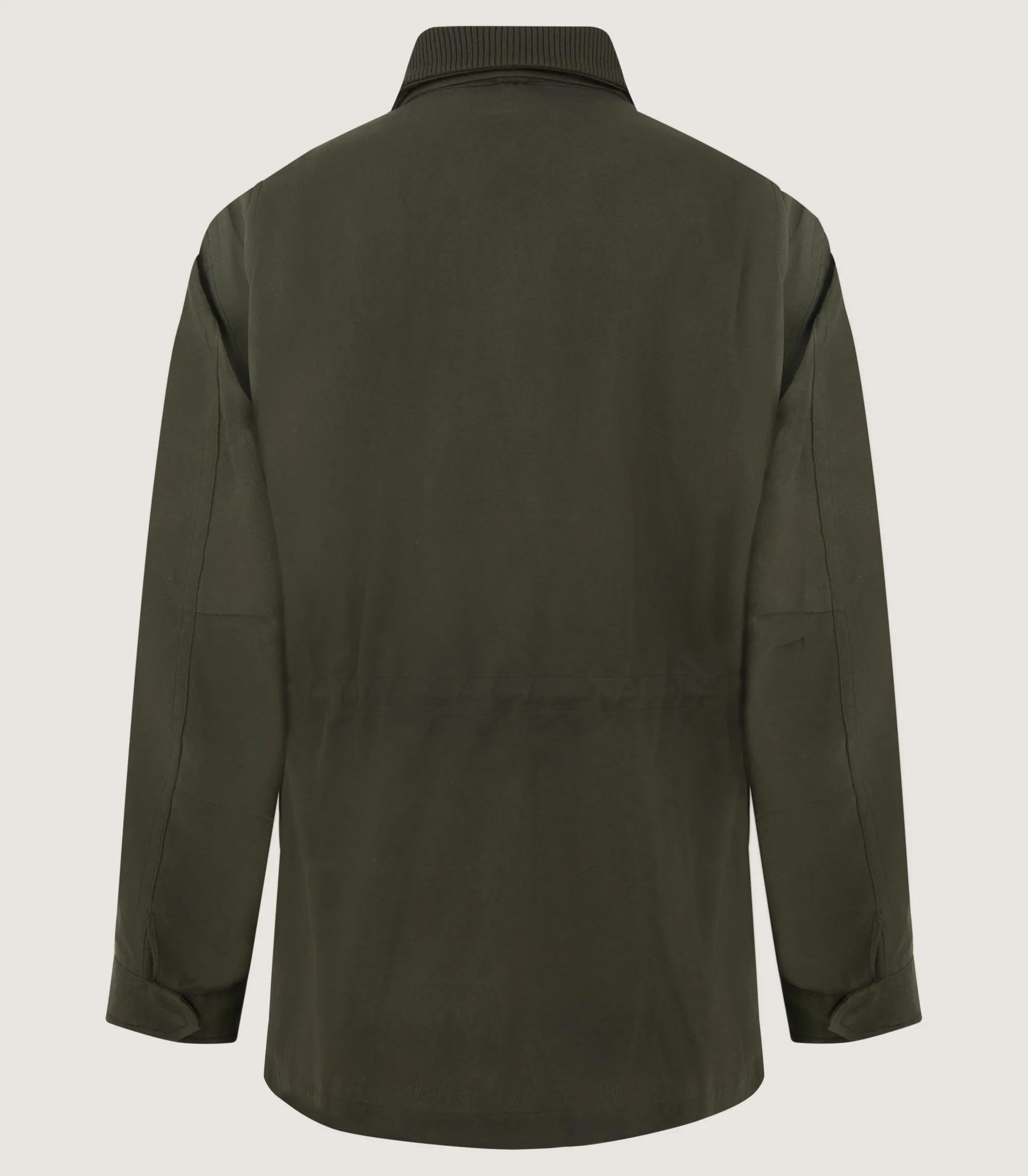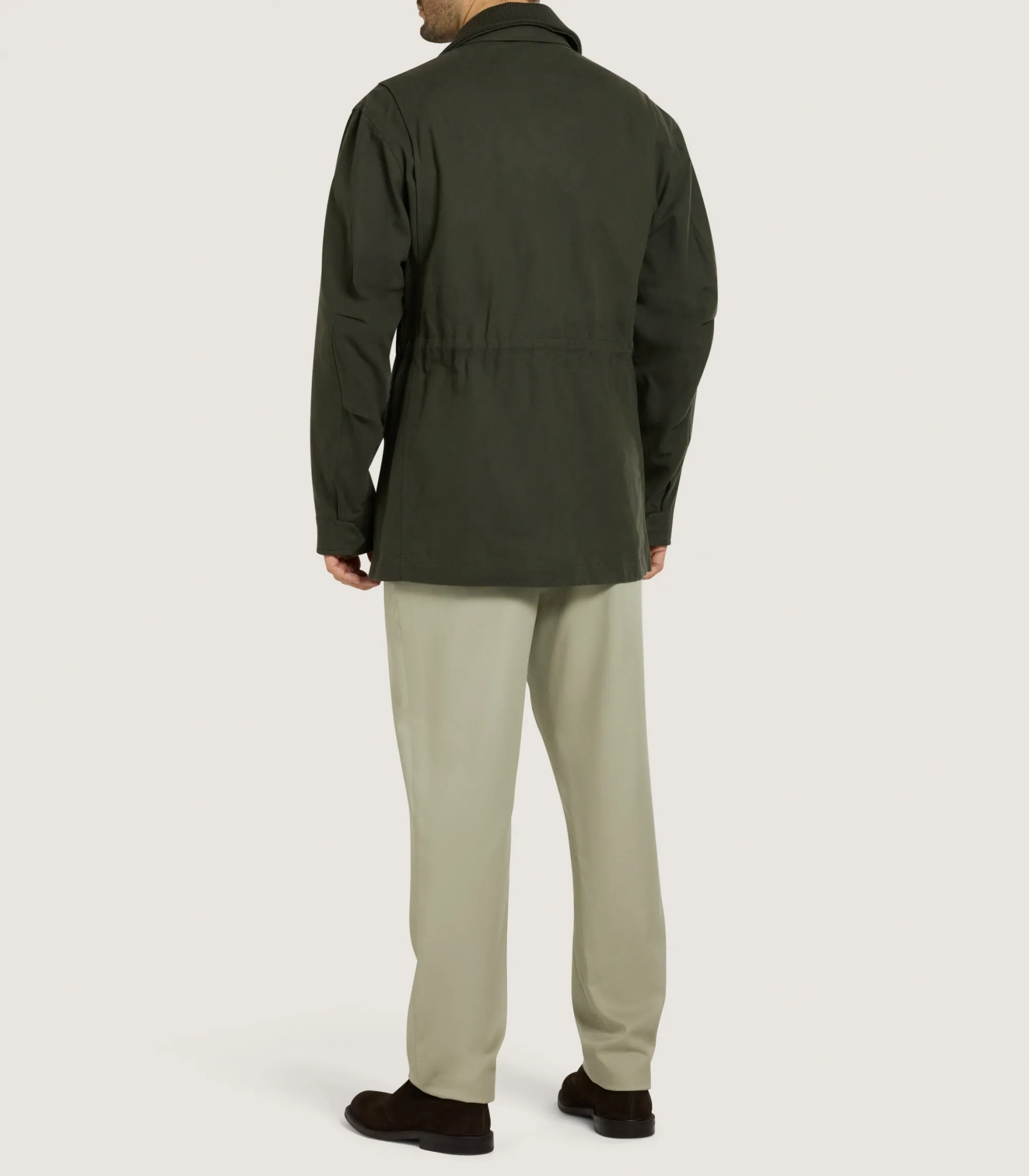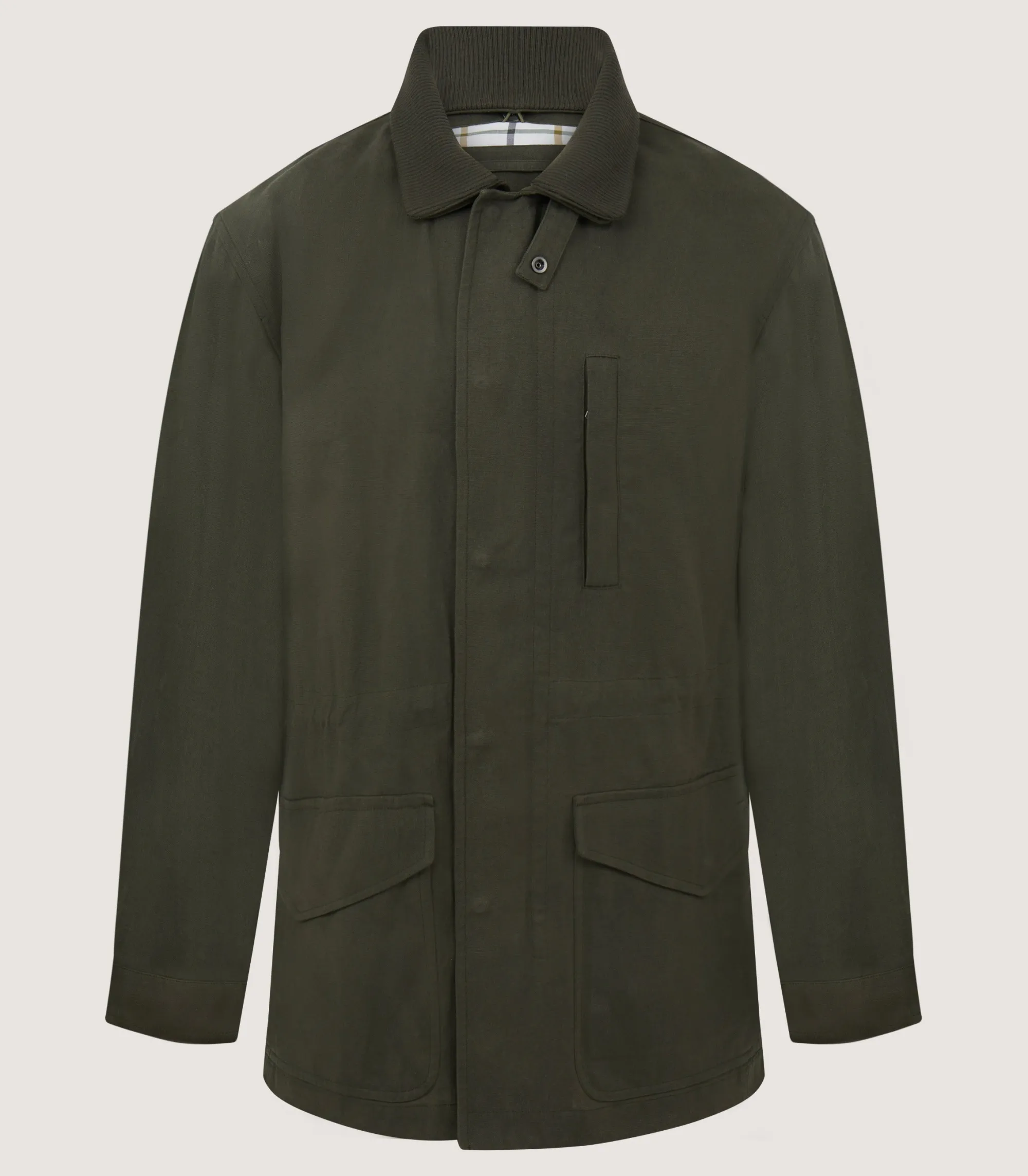 This dark olive coat is an adaption of the Classic Purdey Field Jacket. It is crafted from a cotton linen blend that was woven in Scotland. This fabrication has a water repellent finish with a soft and waxy handle.