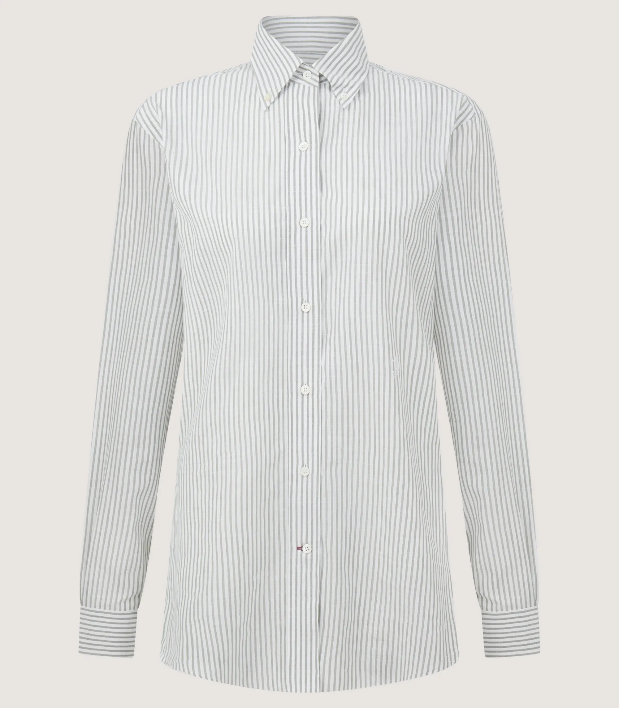 An elevated take on an essential dressing staple, this cotton linen shirt has a country stripe in a delicate sage colour. There is a signature JP monogram embroidered at the waist with a distinctive Purdey red thread on the lowest button.