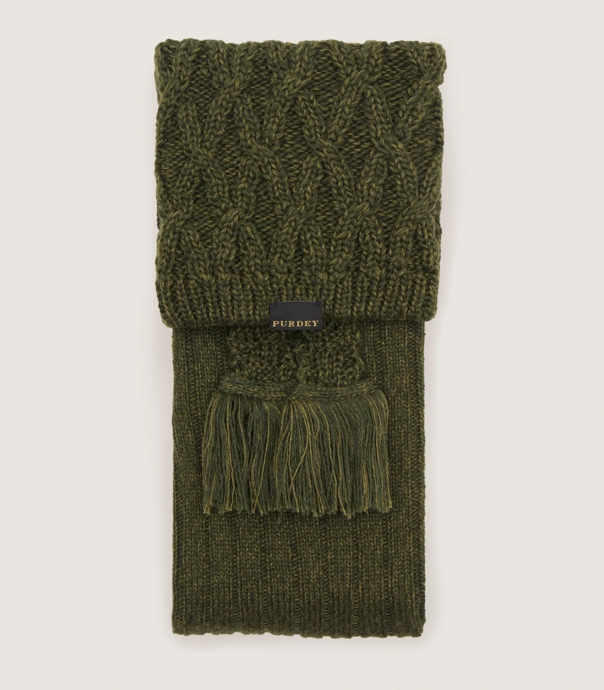 Knitted socks in a melange wool with cable detailing a top, made of a merino blend.
