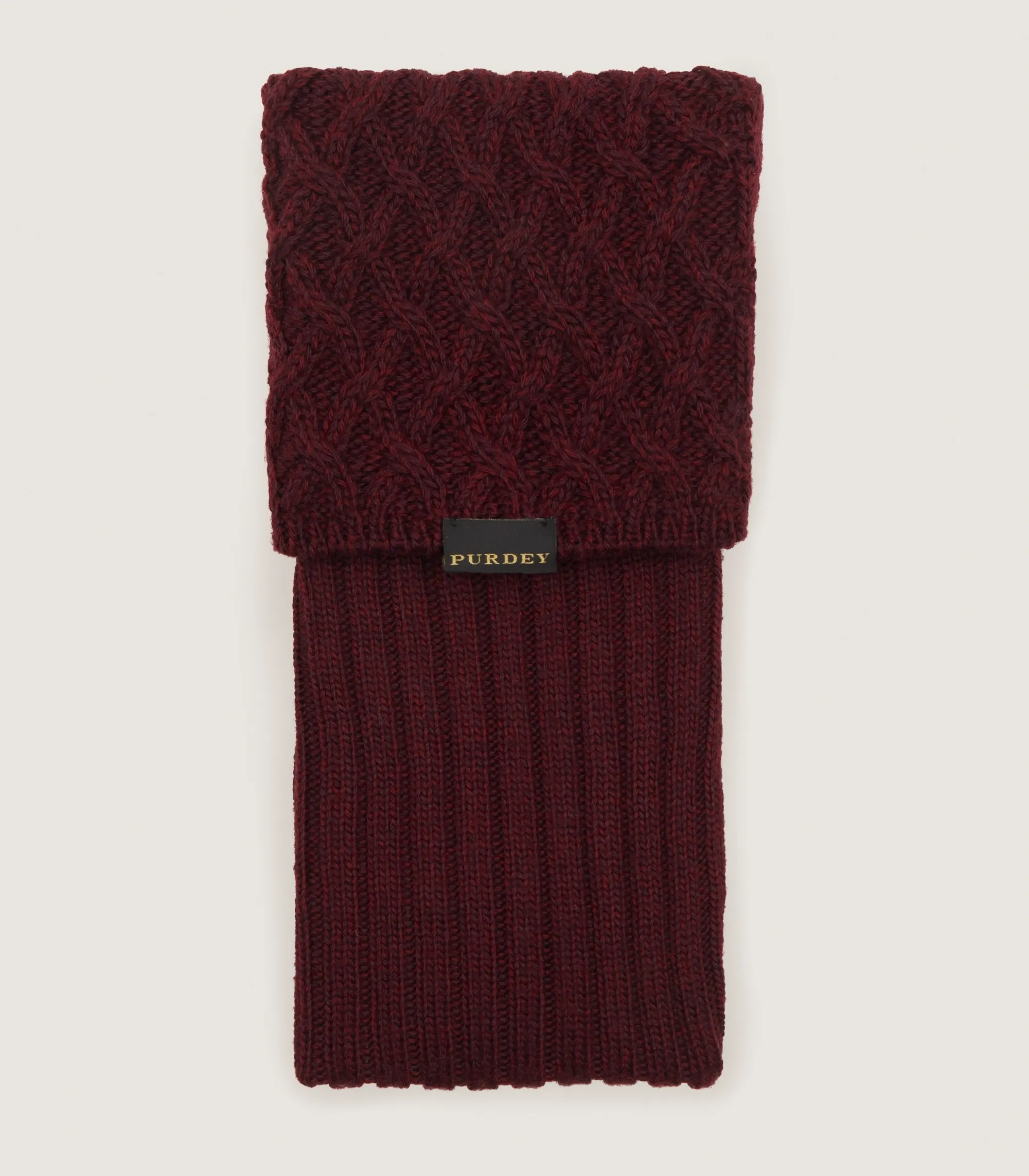 Knitted socks in a melange wool with cable detailing a top, made of a merino blend.
