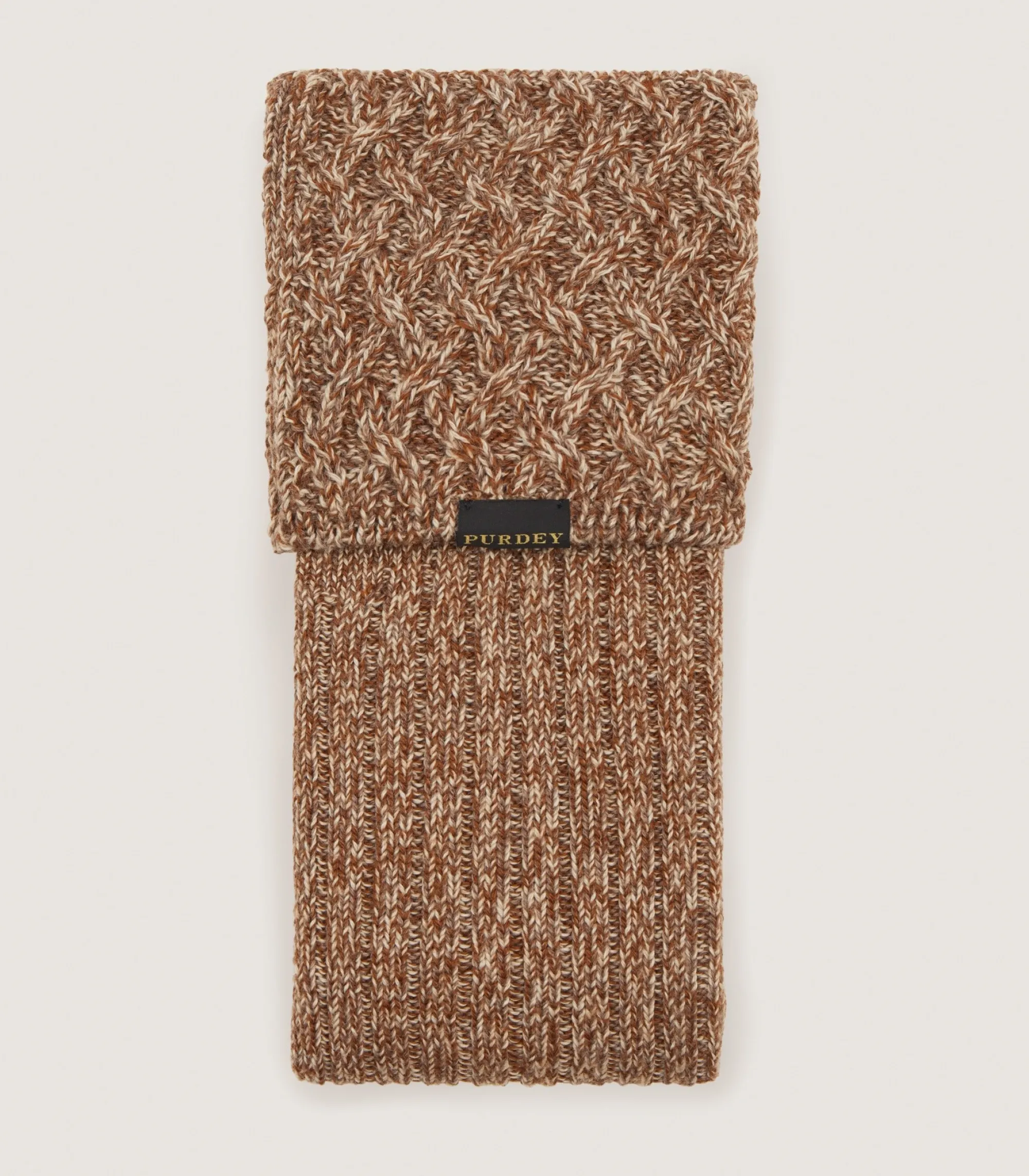 Knitted socks in a melange wool with cable detailing a top, made of a merino blend.