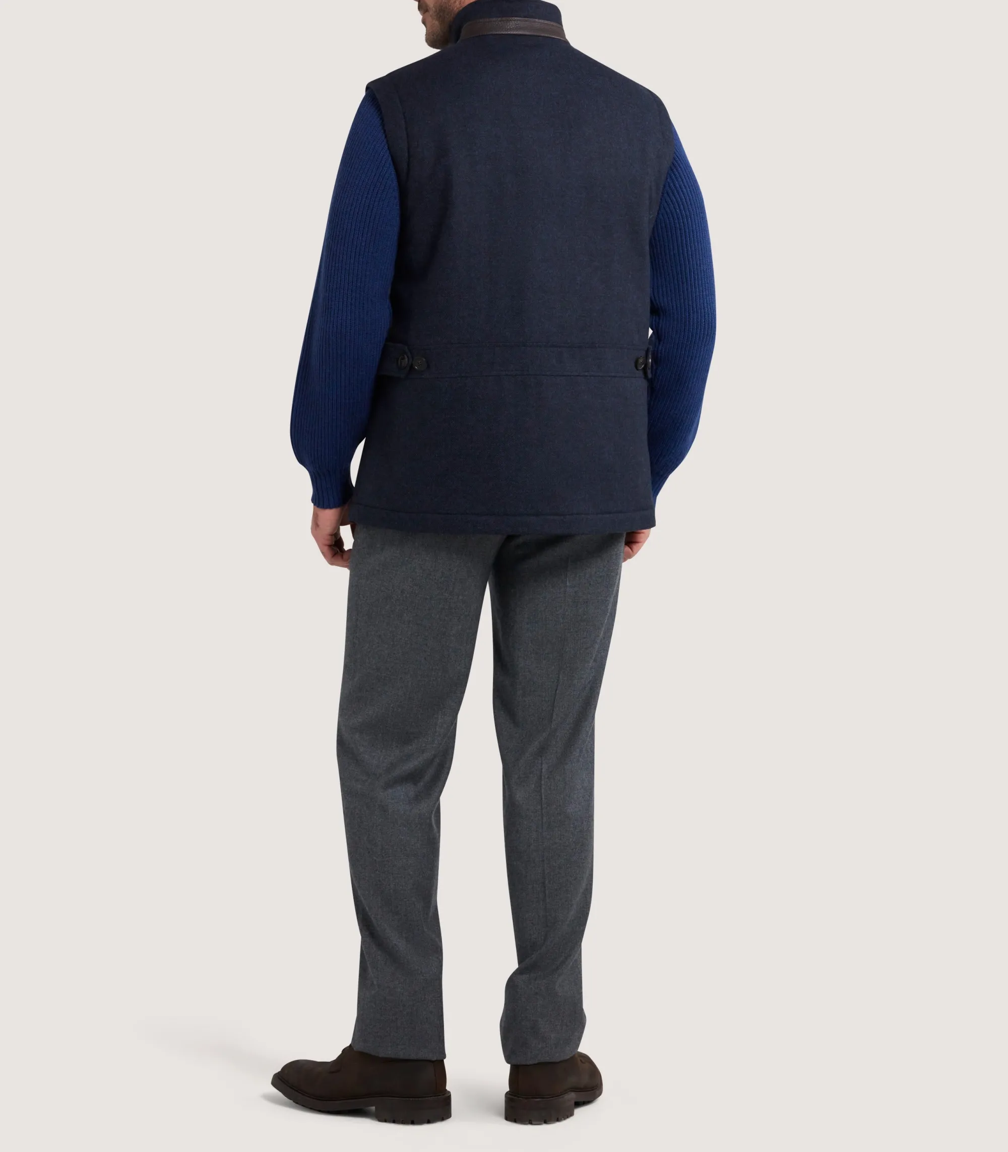 Made in Italy, the Warwick Stand Collar Gilet in midnight navy combines Italian wool and a lining of quilted nylon padding with recycled HD wool. Bringing together technical and lifestyle wear, it has concealed snaps on the front pockets and a back waist adjuster for a more refined fit.