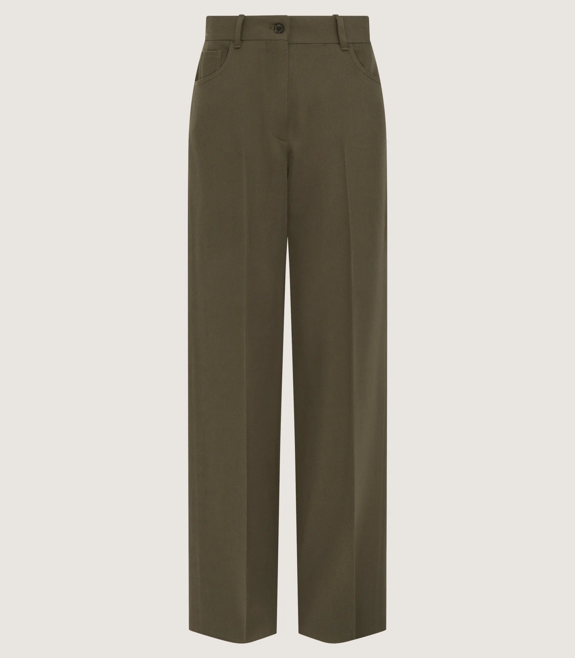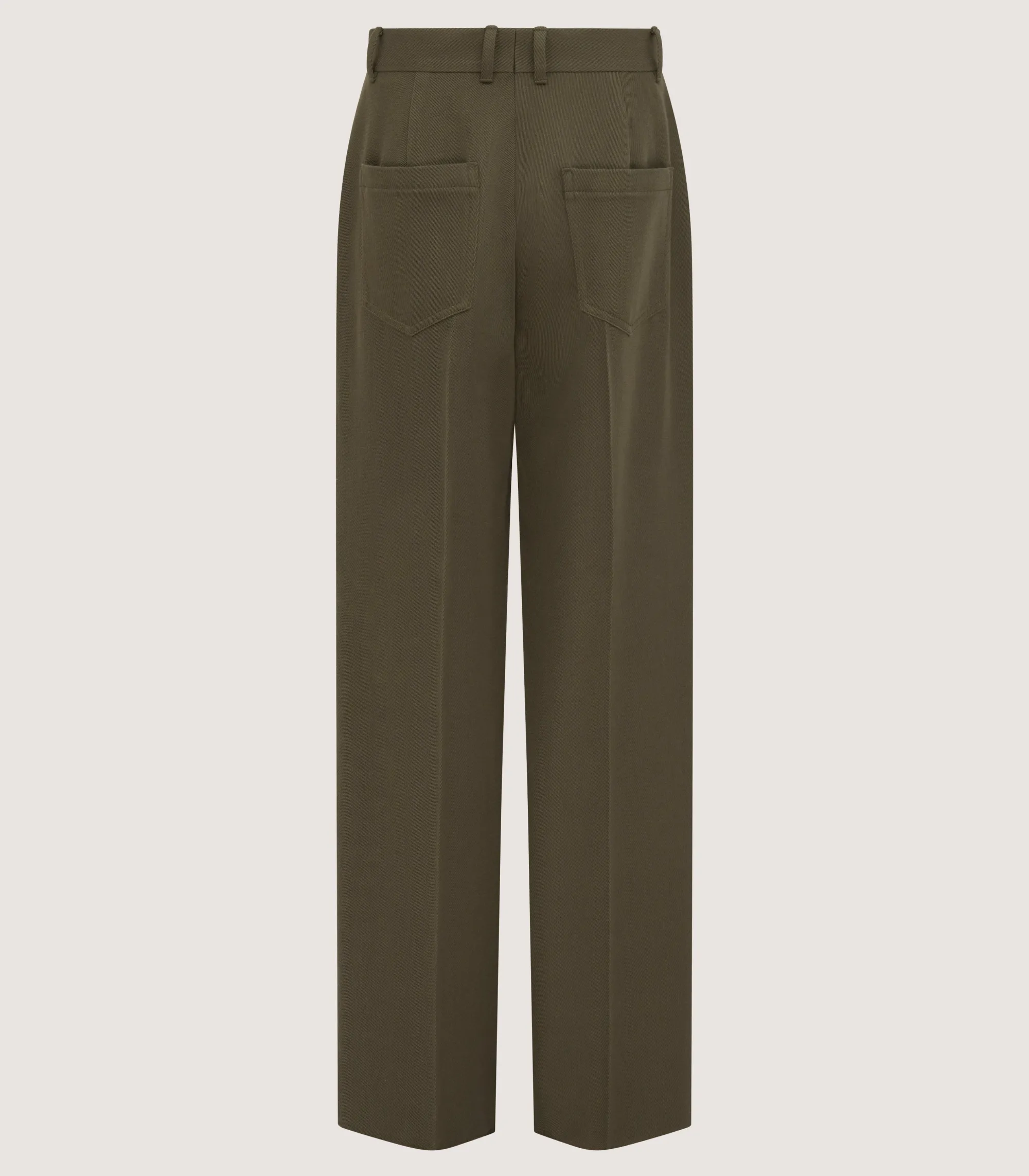 The Seymour trouser is a unique addition to the autumn/winter collection. Made from a lightweight wool twill fabric in a handsome dark olive, it has a wide-leg design with five pockets. The belt loops allow you to style as you desire.