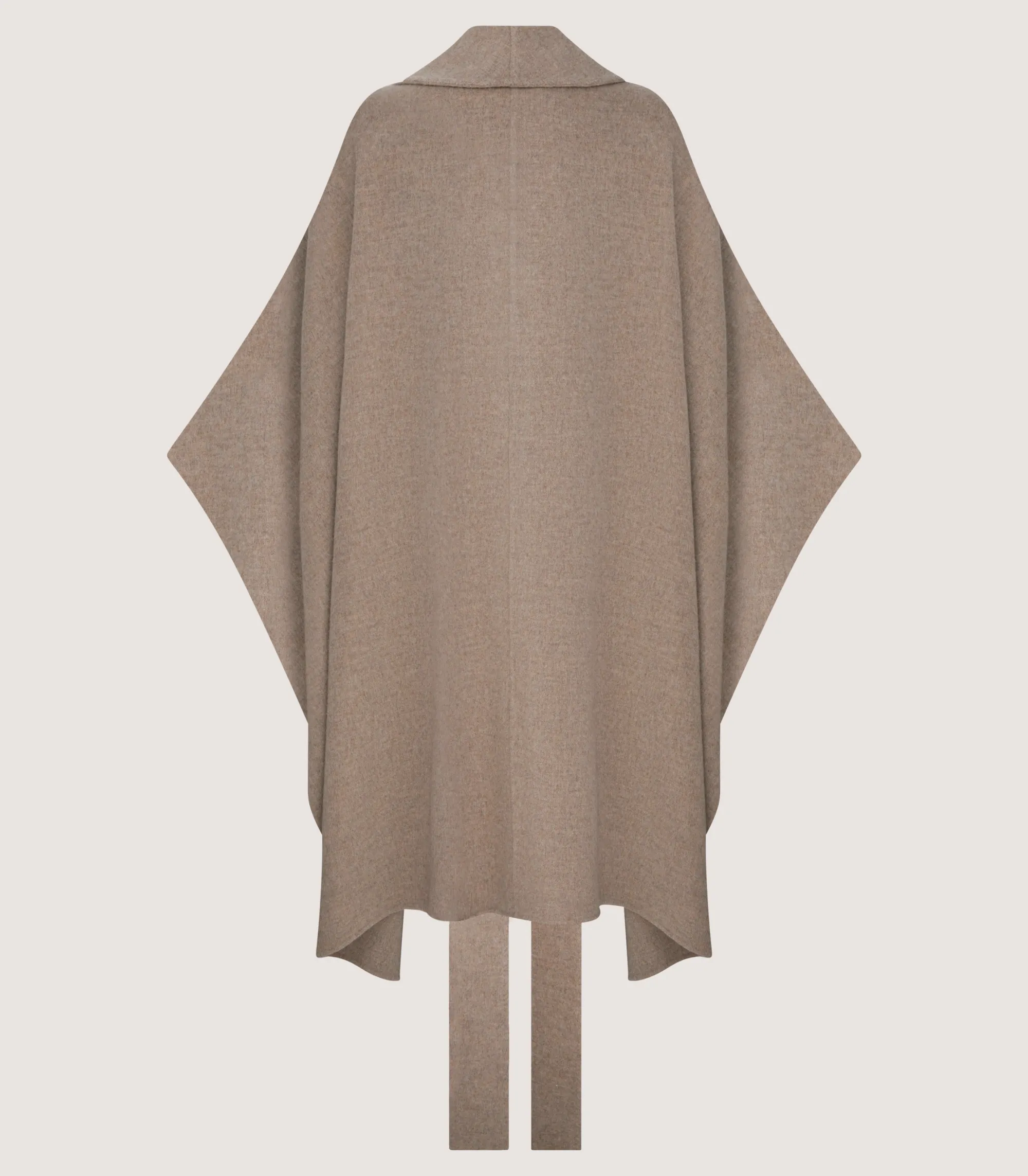A unique alternative to your usual outerwear, this neutral-coloured cape is made from a midweight wool-cashmere blend that was woven in Italy. The soft fabrication drapes over the shoulders and the volume creates a feminine and desirable silhouette. Finished with a shawl collar and matching belt, it can be both dressed up and down.
