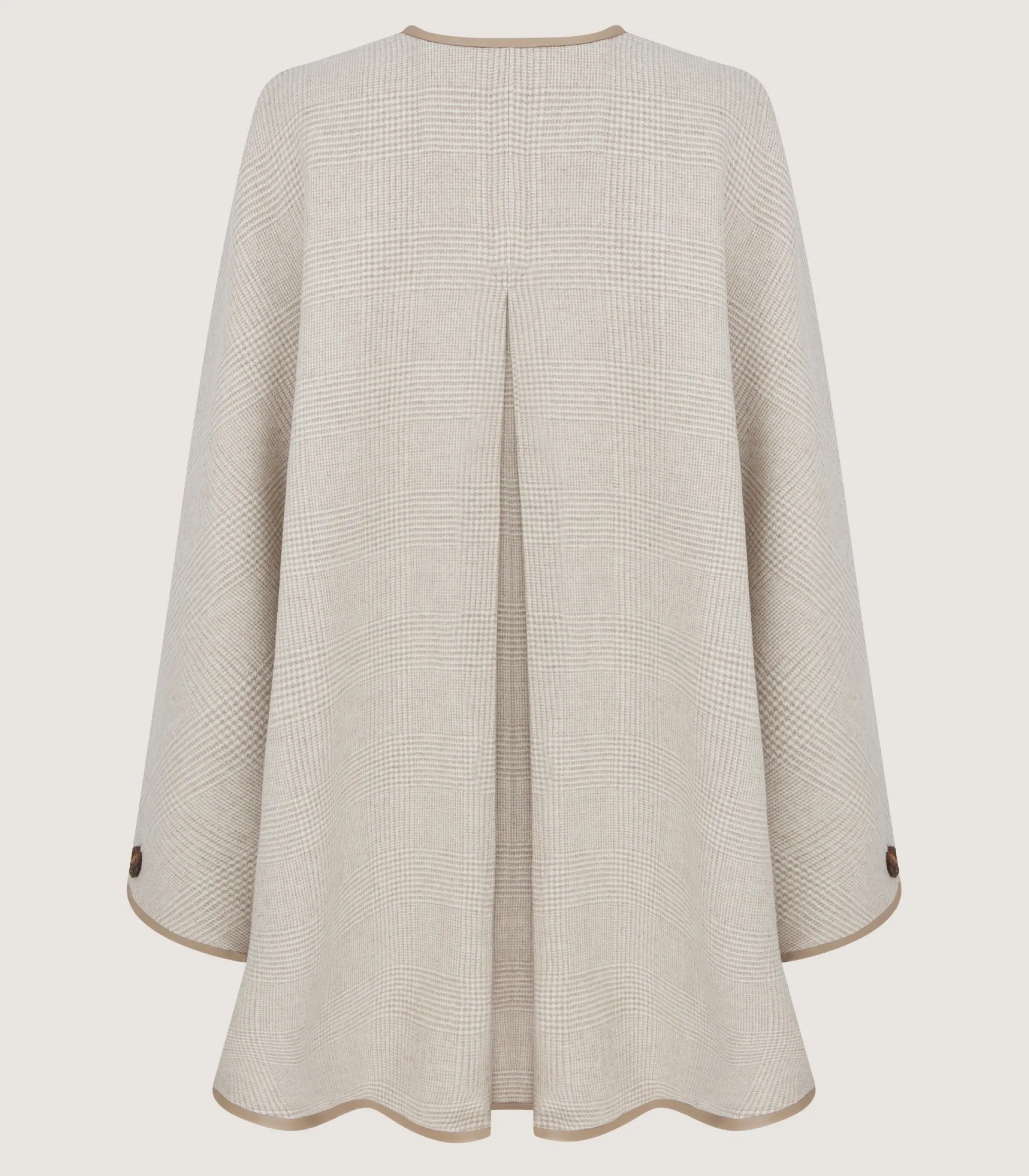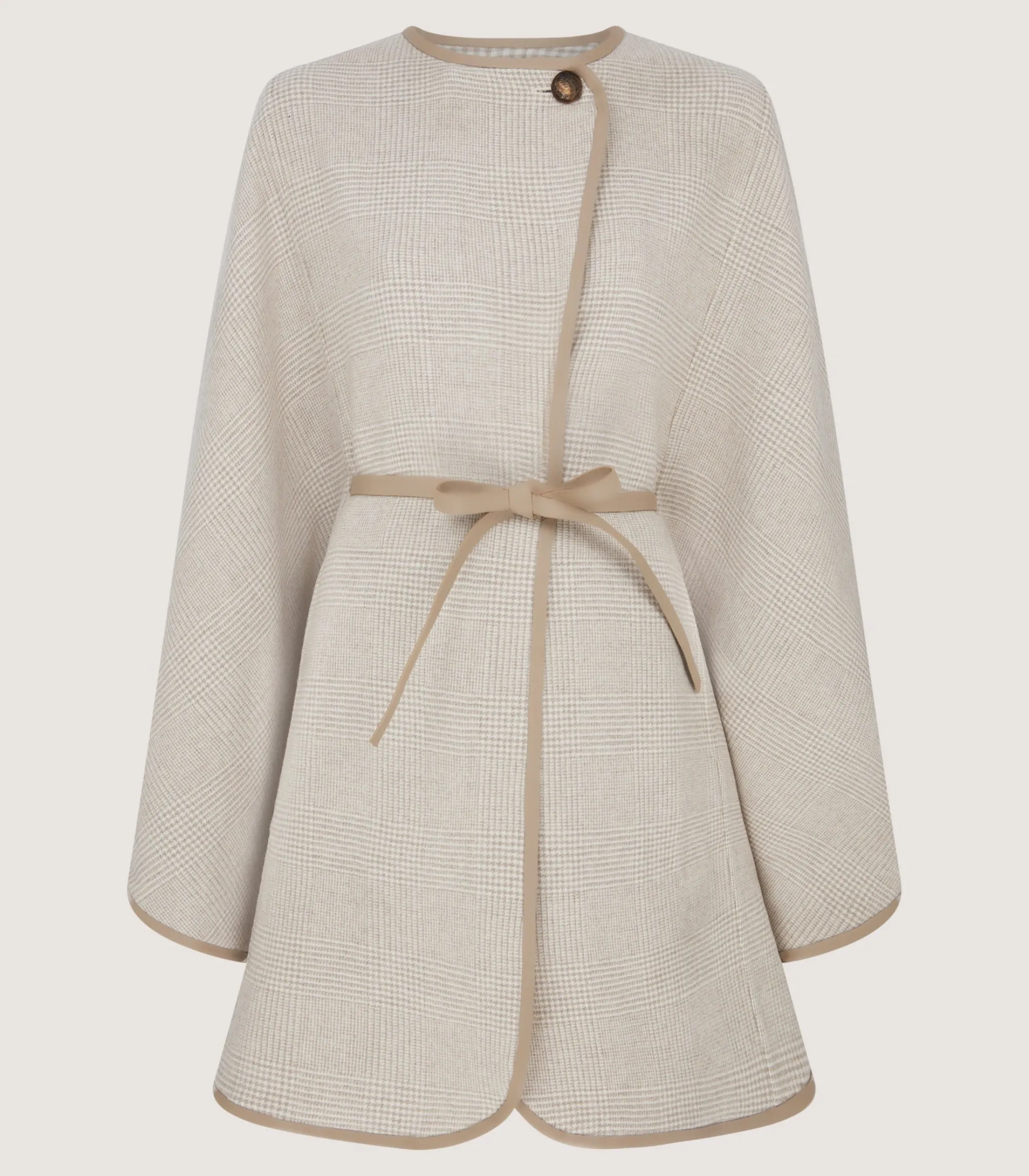 This neutral-coloured cape is made from double-face wool cashmere with a leather trim. It features a Prince of Wales Check on the external shell and a Shepherd Check on the internal lining. The belt allows you to accentuate the waist.