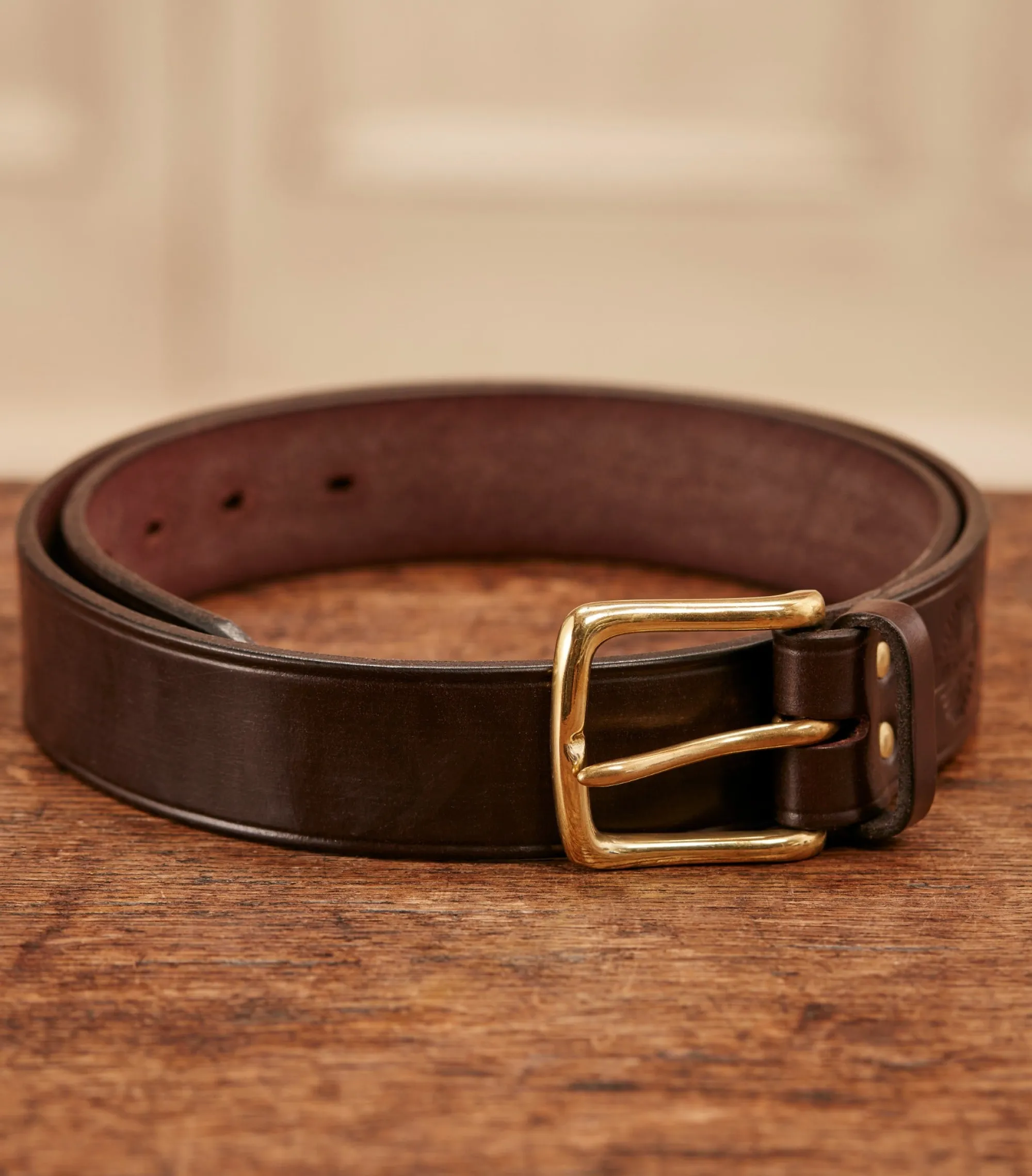 A classic belt in English bridle leather, a particularly durable leather favoured by saddlers with a solid brass buckle. Stamped with the Purdey Starburst.