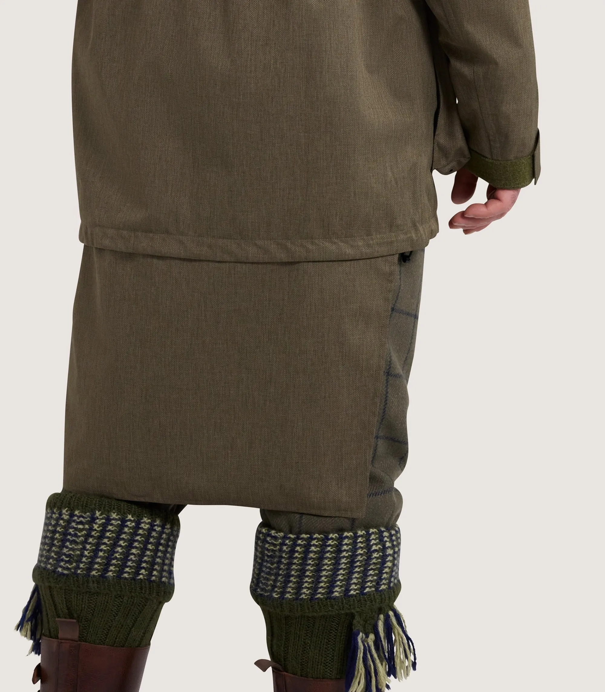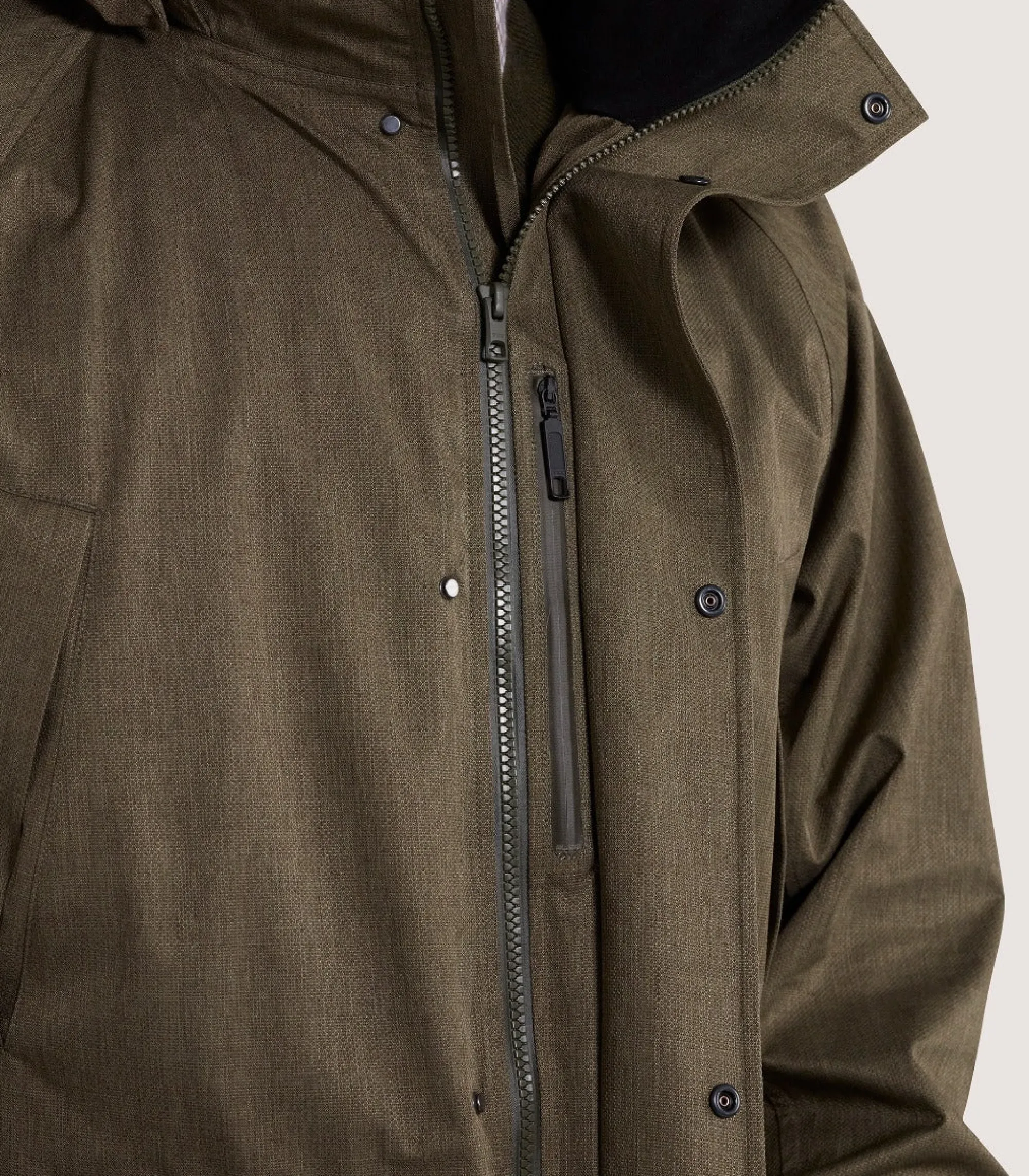 This field coat includes a combination of technical features to keep you dry and comfortable — including centralised back action, a reinforced hood that’s detachable and a drop seat detail to keep you dry when seated on wet surfaces. It’s available in drab green.