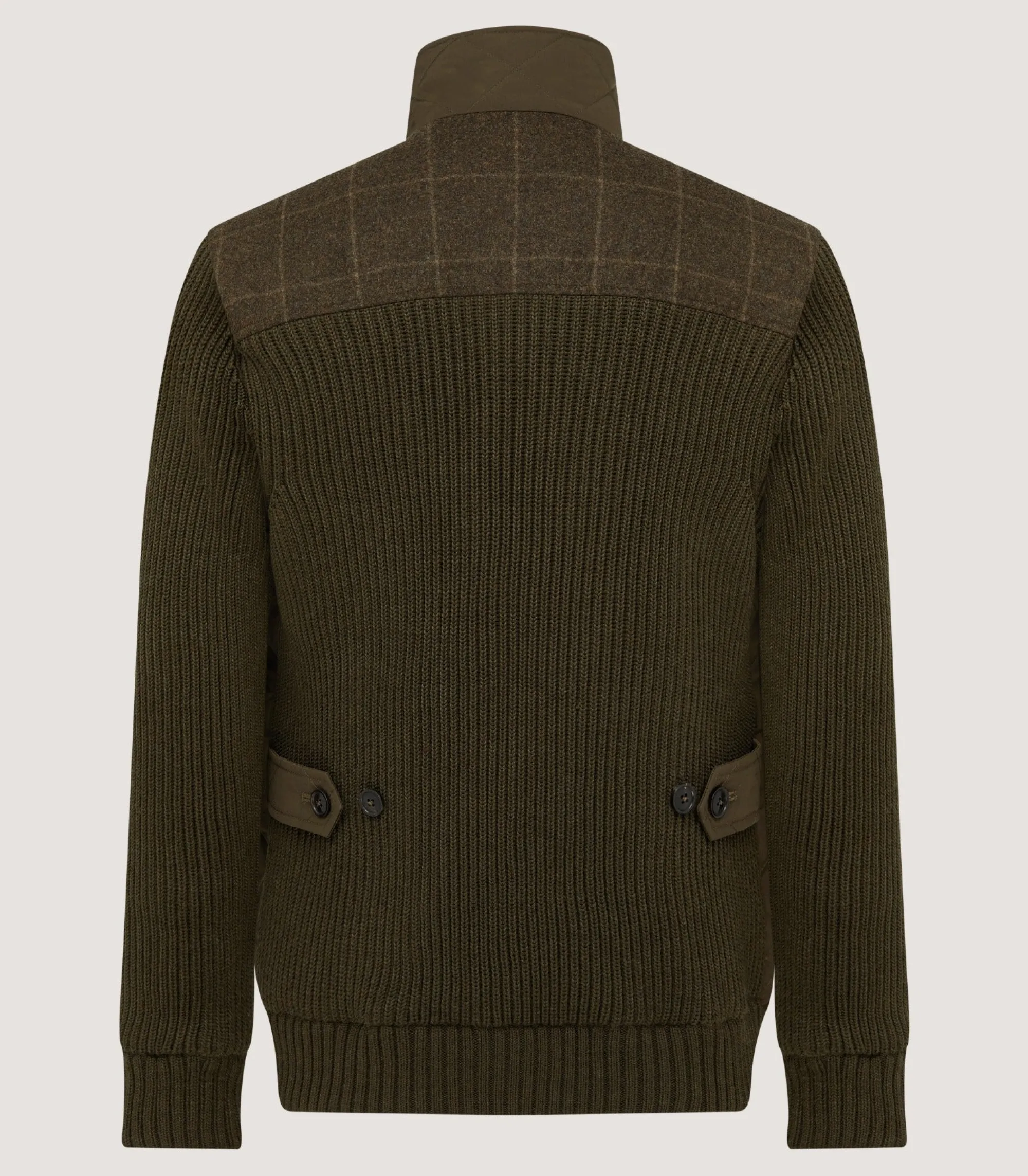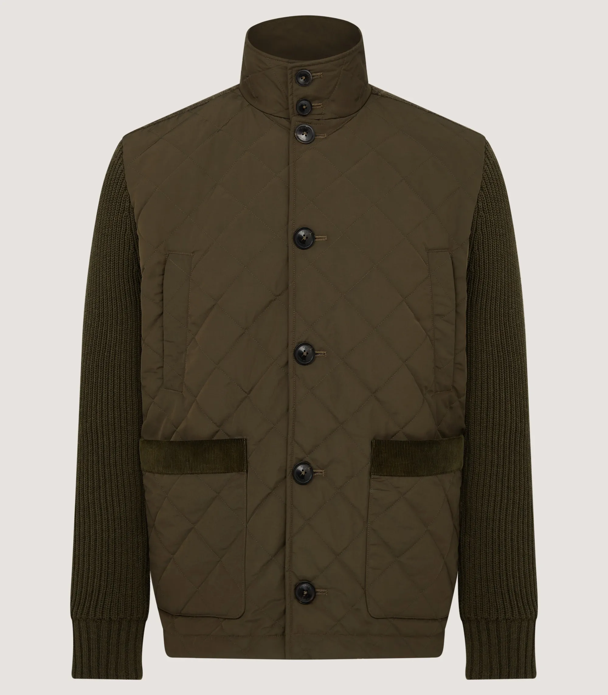 This cardigan is a hybrid outerwear piece that combines knitwear with quilted nylon fabric and tweed yoke. Available in a deep green loden, it’s an elevated everyday outerwear option.