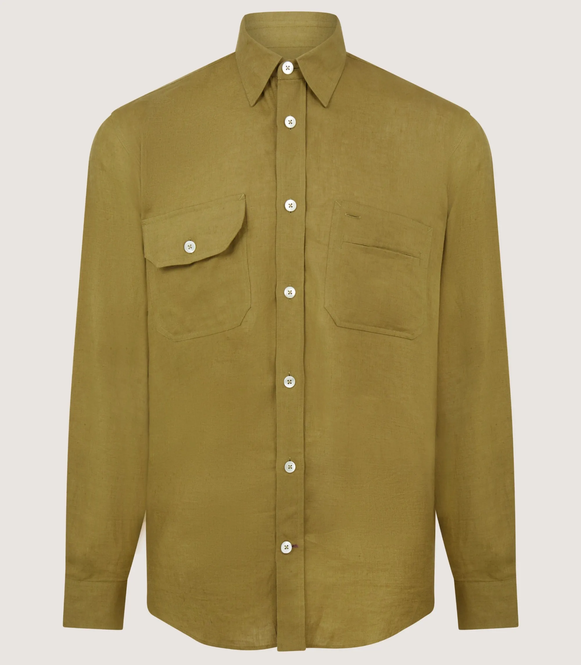 This everyday shirt comes in a warm hue of ochre. Made from lightweight handkerchief linen, this shirt stays cool and fresh during warmer weather. It’s finished with distinctive Purdey thread on the lowest buttonhole.