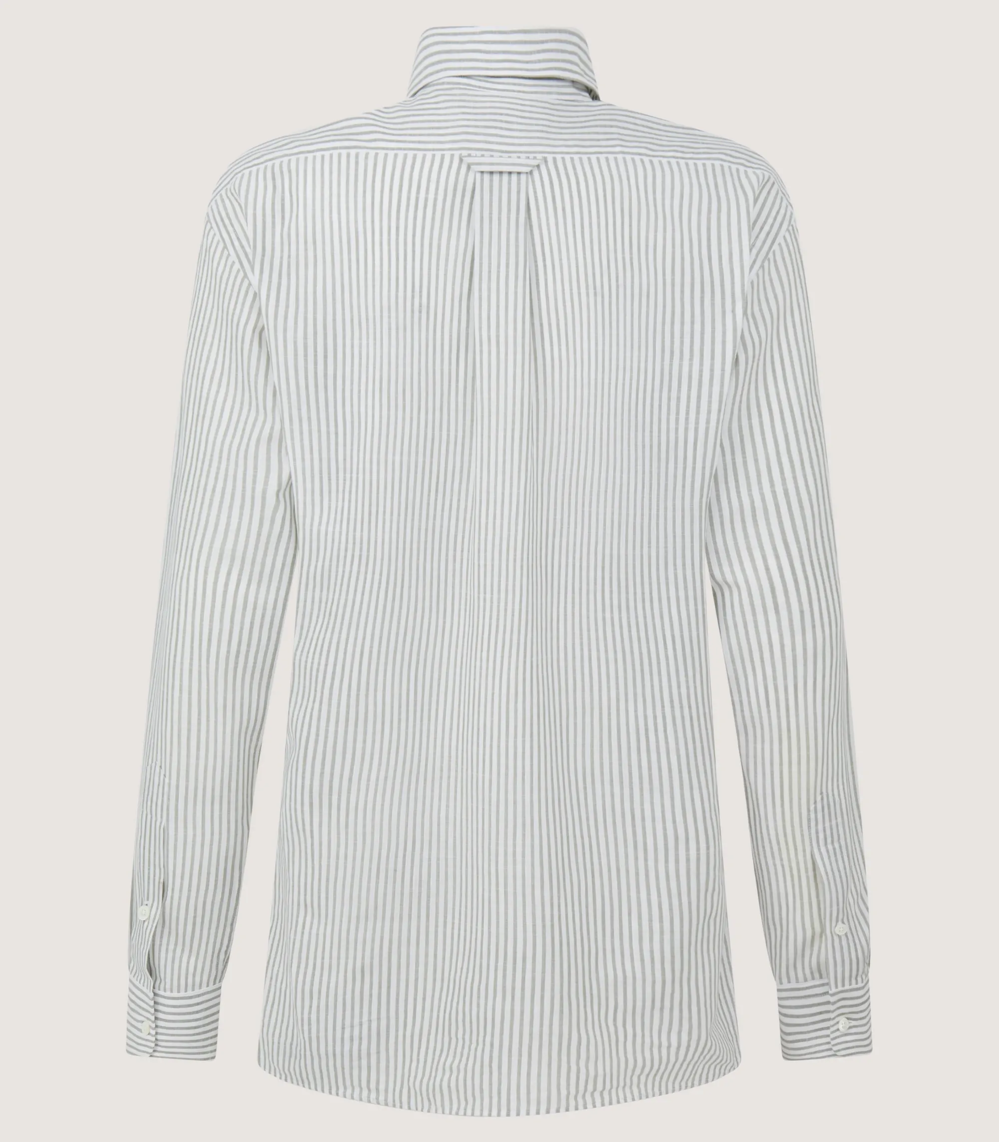 An elevated take on an essential dressing staple, this cotton linen shirt has a country stripe in a delicate sage colour. There is a signature JP monogram embroidered at the waist with a distinctive Purdey red thread on the lowest button.