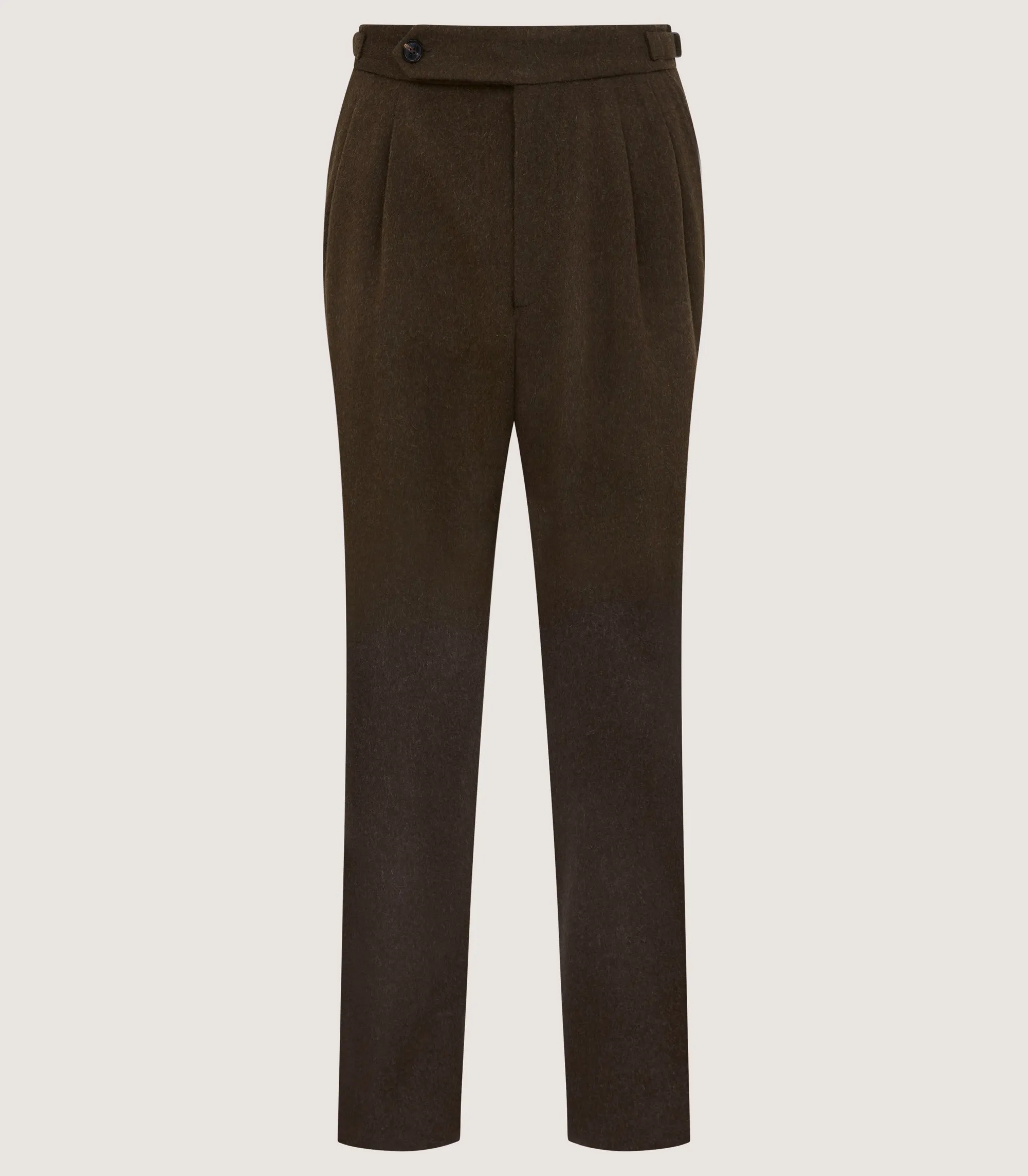 Alpaca wool has a cashmere-like softness and is quick-drying, making it an excellent choice for fieldwear fabrication. Crafted from a blend of alpaca and wool, these sporting trousers offer a superior level of comfort and breathability. They are finished with side waist buckle adjusters and a two pleat detail on the front.